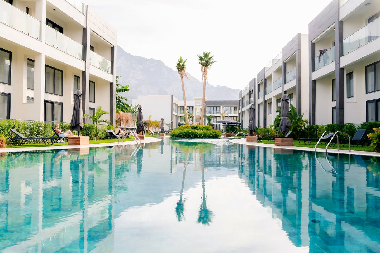 Die Palmera-Anlage liegt ruhig zwischen Meer und Bergen – perfekt für Erholung und Genuss. In wenigen Schritten erreichst du den privaten Strand, während dich die Umgebung mit Natur, Ruhe und mediterranem Flair empfängt. Restaurants, Cafés und kleine Shops sind bequem mit dem Auto erreichbar, die lebendige Hafenstadt Girne (Kyrenia) ist nur ca. 18 km entfernt und lädt zum Bummeln und Entdecken ein.