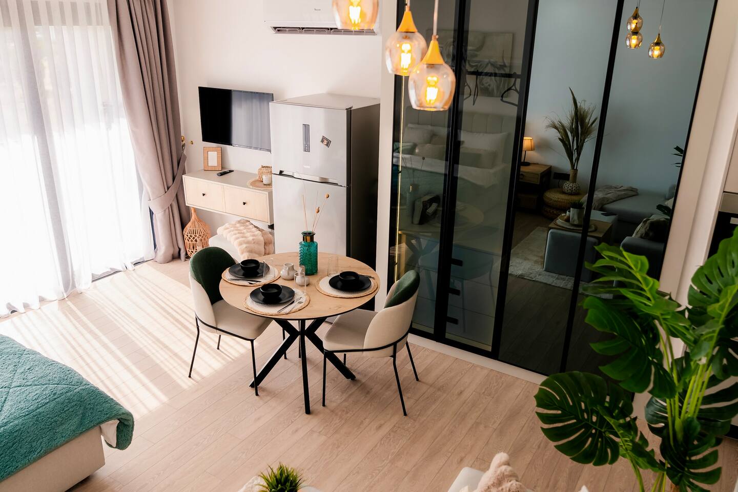 ✨ Stylish Studio – Your Retreat Between the Sea and the Mountains ✨ Hello! I’m Ferhat—an experienced host with over ten years of Airbnb experience. Together with my team, I’ll make sure your stay is unforgettable—with personalized service, local expertise, and genuine hospitality. This modern studio offers stylish living comfort in a compact space—perfect for 1–2 people. The private balcony with a stunning view of the mountain panorama is the perfect spot for breakfast or unwinding. Just a few steps away is the private beach—ideal for swimming, sunbathing, or simply relaxing. 🏖️ Highlights at a glance: ➤ Just 200 m from the sea – with direct access to the private beach ➤ Balcony with stunning mountain views – enjoy nature in a peaceful atmosphere ➤ Perfect for 2 guests – comfortable double bed & modern amenities ➤ Kitchenette with stovetop, refrigerator & coffee maker ➤ Stylish bathroom with shower & natural light ➤ Wellness, spa & fitness: sauna, hammam, massages & indoor pool right on the property ➤ Two outdoor pools + pool bar – drinks & cocktails under the palm trees 🍹 Your Studio Here, style, functionality, and a feel-good atmosphere come together: ➤ Living/sleeping area: flooded with light, featuring a cozy double bed, dining table, and direct access to the balcony ➤ Kitchenette: equipped with everything you need—including a stovetop, microwave, refrigerator, and coffee maker ➤ Bathroom: modern design with shower, sink, and plenty of natural light Your balcony with mountain views 🌄 Enjoy peaceful mornings or romantic sunsets with a view of the mountains—perfect for a glass of wine or a relaxing cup of coffee. The Complex & Surroundings This high-end residential complex offers everything you need for a perfect stay: ➤ Wellness & Spa: hammam, sauna, steam room, massage rooms ➤ Fitness area & indoor pool: ideal for working out and relaxing ➤ “Rythm” Restaurant: Mediterranean cuisine & refreshing drinks ➤ Pool bar: Cocktails & refreshments right by the water Whether it’s a romantic getaway, a digital detox, or a relaxing solo trip—this stylish studio is your perfect base for unforgettable days in Northern Cyprus. 👉 Book now & experience the best of nature, design, and hospitality!