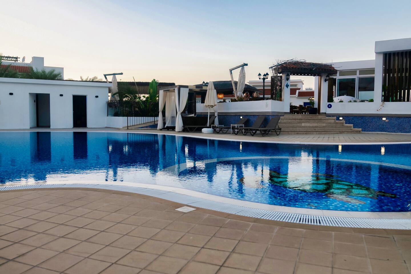 Als Gast hast Du Zugang zu allen Räumen sowie zum Balkon und der Dachterrasse, die du direkt von der Wohnung aus erreichst. Einrichtungen in der Anlage: - Gemeinschaftspool mit Sonnenbetten - Gym - Spa mit Indoor-Pool - Restaurant - Grillplatz - Minigolf