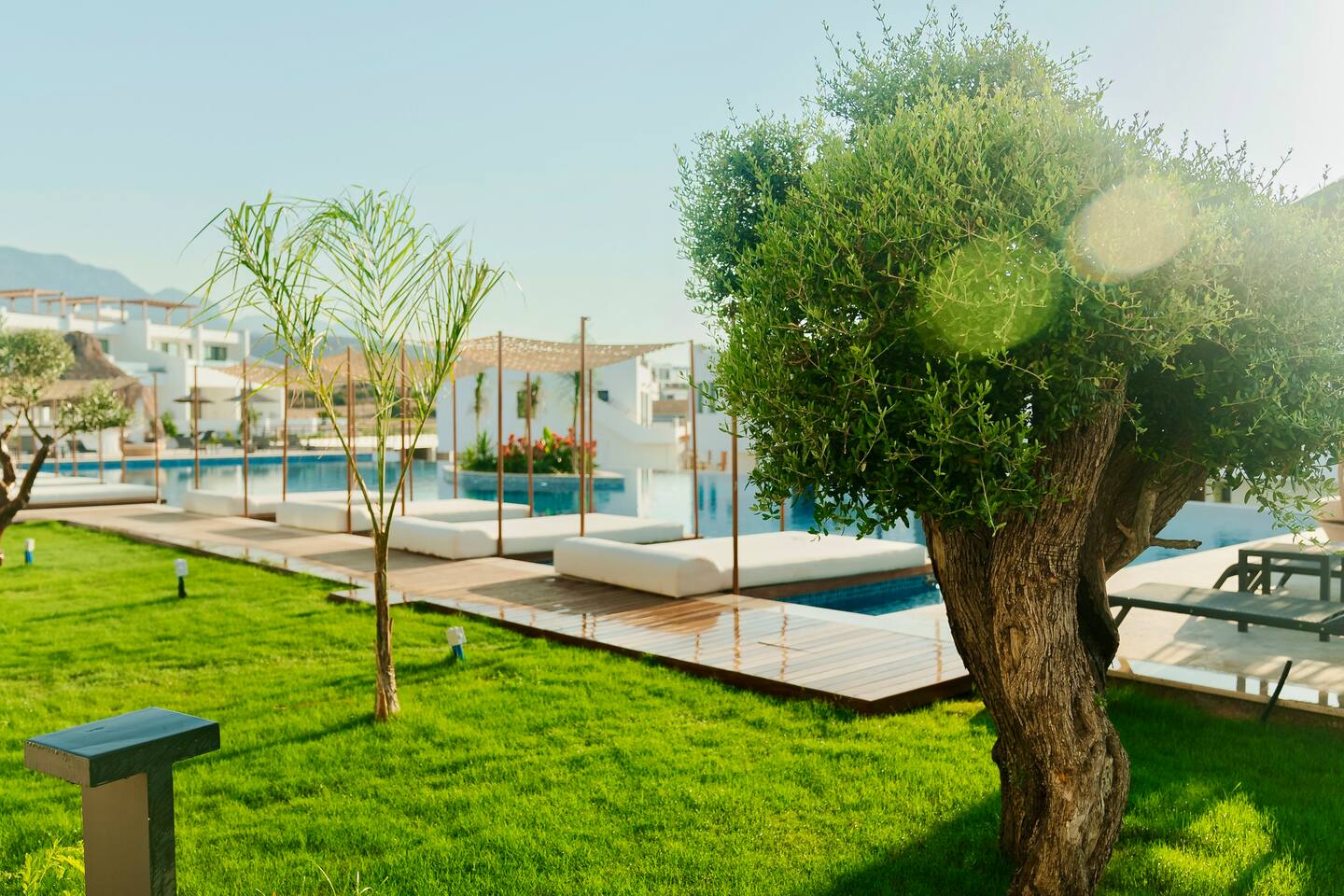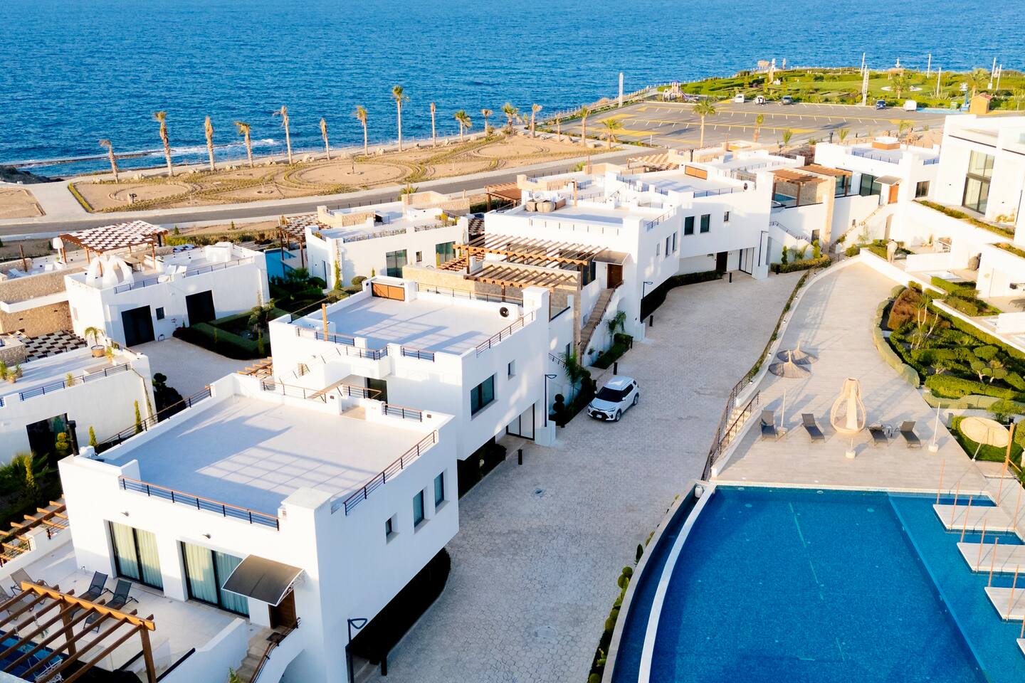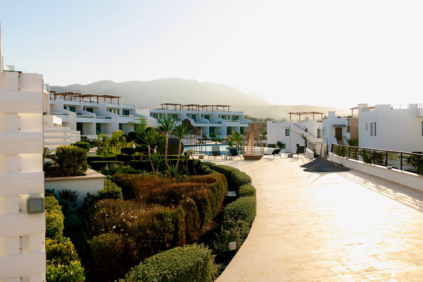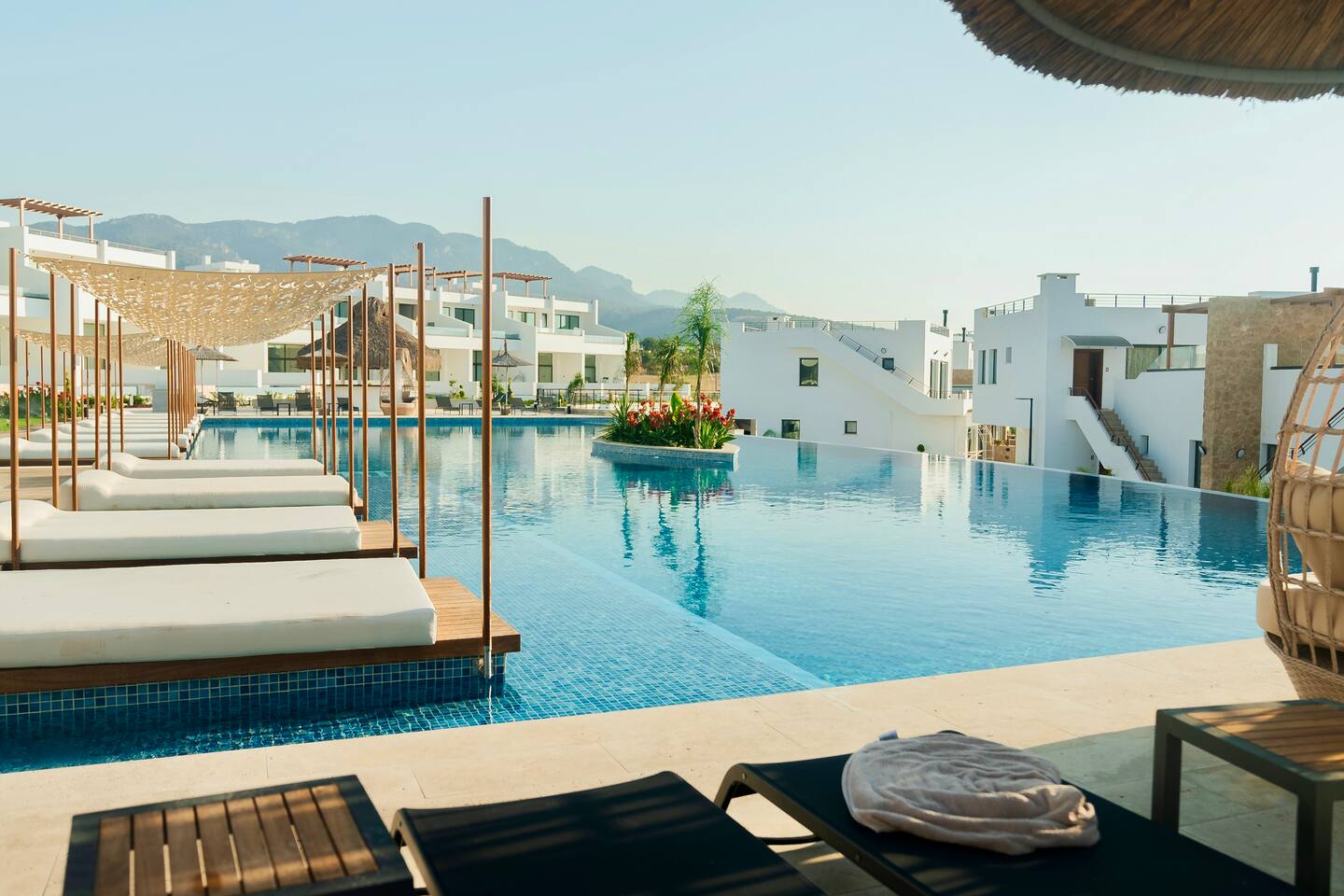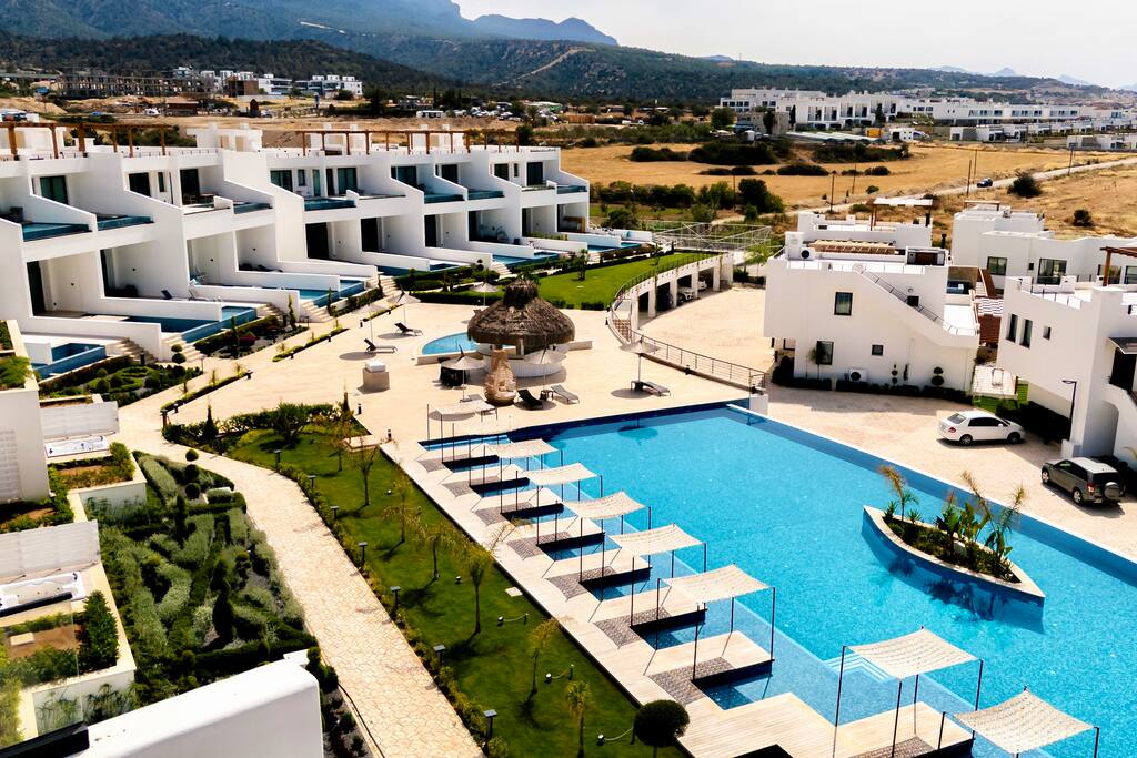 Die Anlage „Mykonos Homes“ liegt idyllisch zwischen Meer und Bergen und bietet dir den perfekten Rückzugsort zum Entspannen. Der private Strand ist nur wenige Schritte entfernt. Ein Supermarkt ist bequem zu Fuß erreichbar, ebenso wie ein sehr gutes Restaurant in der benachbarten Anlage „Maldives Homes“ – ideal für ein entspanntes Abendessen ohne Auto. Weitere Restaurants, Cafés und kleine Shops erreichst du schnell mit dem Auto. Für einen Ausflug lohnt sich die Hafenstadt Girne (Kyrenia) (ca. 31 km entfernt) mit ihrer Altstadt, der Promenade und vielen schönen Plätzen zum Entdecken.
