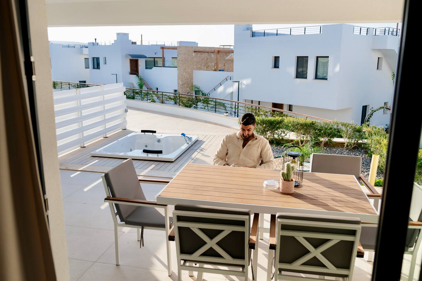 Stilvolle Wohnung mit Terrasse & Jacuzzi in einer luxuriösen Anlage! Genieße erholsame Nächte, eine voll ausgestattete Küche, schnelles WLAN und deinen privaten Entspannungsbereich. Die Anlage bietet Fitnessraum, beheiztes Hallenbad, Hamam, Pool, private Bucht und Restaurant. Perfekt für Paare, Familien oder Alleinreisende – ideal für eine entspannte Auszeit auf Zypern. Buche jetzt!